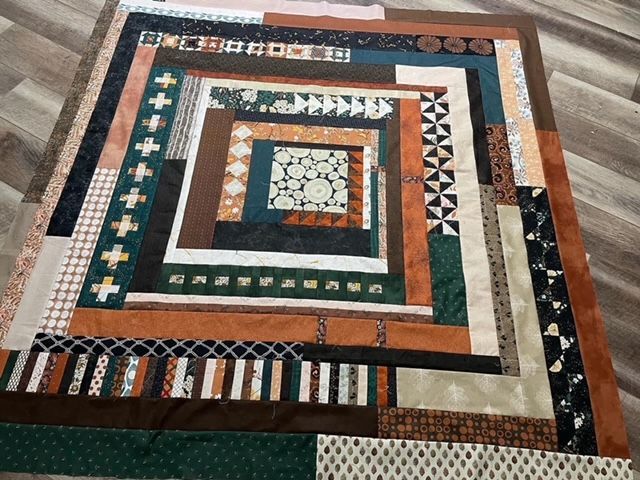 This backing looks awesome with the top, in color and theme, as nature inspired fabrics are really the hottest trend right now in interior design and quilting fabrics alike. For the pattern I used Daylesford by Jen Kingwell out of her Quilt Recipe book. As you can see it is a blown up version of a log cabin (huge block). The fabrics I selected are all fabrics with natural and textural elements. The colors are equally important and natural: dark green ("forest night" or "bottega green"), one of the newest colors of the moment, medium browns, blush, rust, brown and black as the main colors. I believe this quilt could fit in any new 2023 family room. If anyone is interested in a kit, I can gladly made this up for you. All fabrics will be labeled. I actually made a custom kit of this pattern in other colors for a customer as well. Fun!