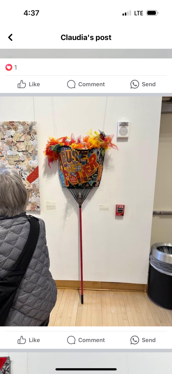 At the Sew to Speak exhibition the artist's statements are extremely important: what is the artist trying to say with the work? What is the message that is in there? Some very powerful pieces are on display that would never made it into a quilt show, because the work is not quilted to begin with, not quilted "properly" or the result is not necessarily even "pretty". One artist, Eleanor Levie, used a rake in the display of her artwork! In "Grounds4Removal" she created a powerful message which, I am sure, is more important to her than making a pretty quilt! It is about sewing with fabric and expressing a thought that way. It is not about making beautiful quilts. The artist's statements are crucial to read to understand what the idea behind the work is.