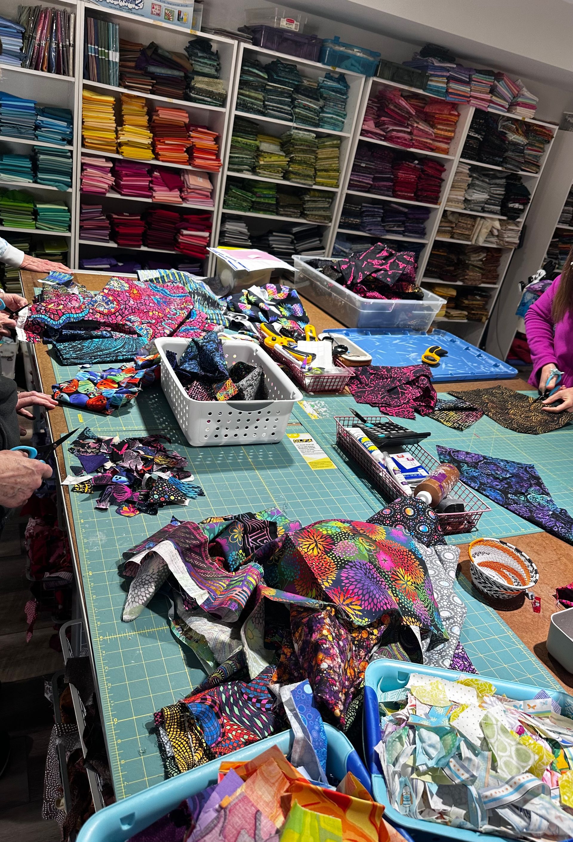 The class is a full day class and requires a lot of scraps. It's not for someone who is just starting to quilt. Students are being asked to choose either a warm or a cool color way and bring at least 150 scraps (can be as little as 1” x 1”). This will not be enough to make the entire quilt, but it will be enough to learn the technique. People who don't want to go through their stash can order the optional kit, but this kit will also not enough to do an entire quilt. You will always need more time at home to finish what we started using your own fabrics.
