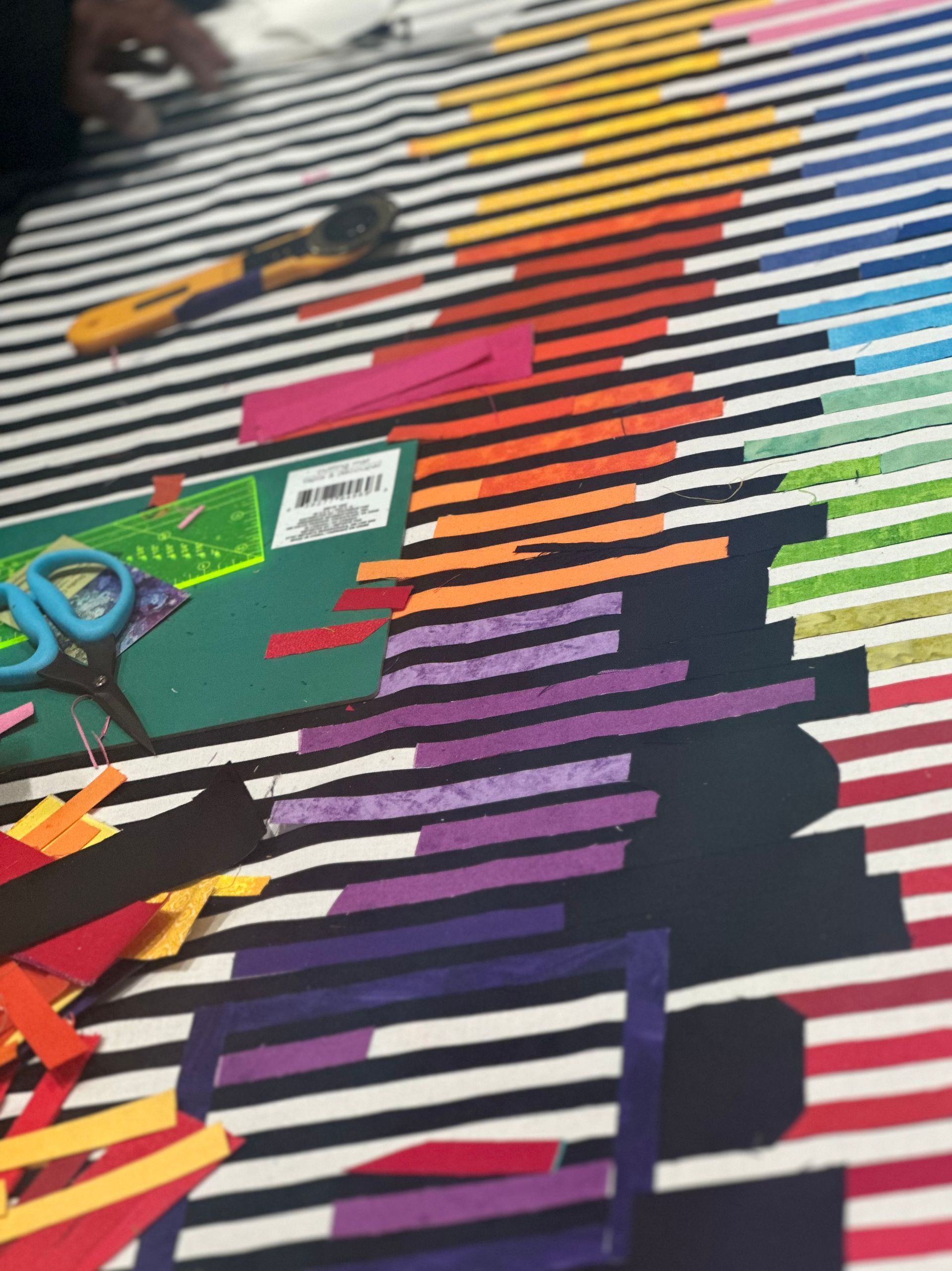 In this workshop students are doing a different kind of improvisational collage. Working with solid colors only, it is about creating a wall hanging with movement and dimension in the style of the sculptor Yaacov Agam. The class will take 4-6 hours and students will have made a good start of their project at the end, enough to finish independently. The workshop is all about making the design and super fun. A mix of collage and improv quilting. Suitable for every level, but students need to be able to cut .5” pieces of fabric precisely. The Mini Stripology ruler is handy. Students can bring their own solids (optional kit is available) but a kit for background and fusible is necessary for workshop. The optional kit will give you all the solids needed for a quilt.