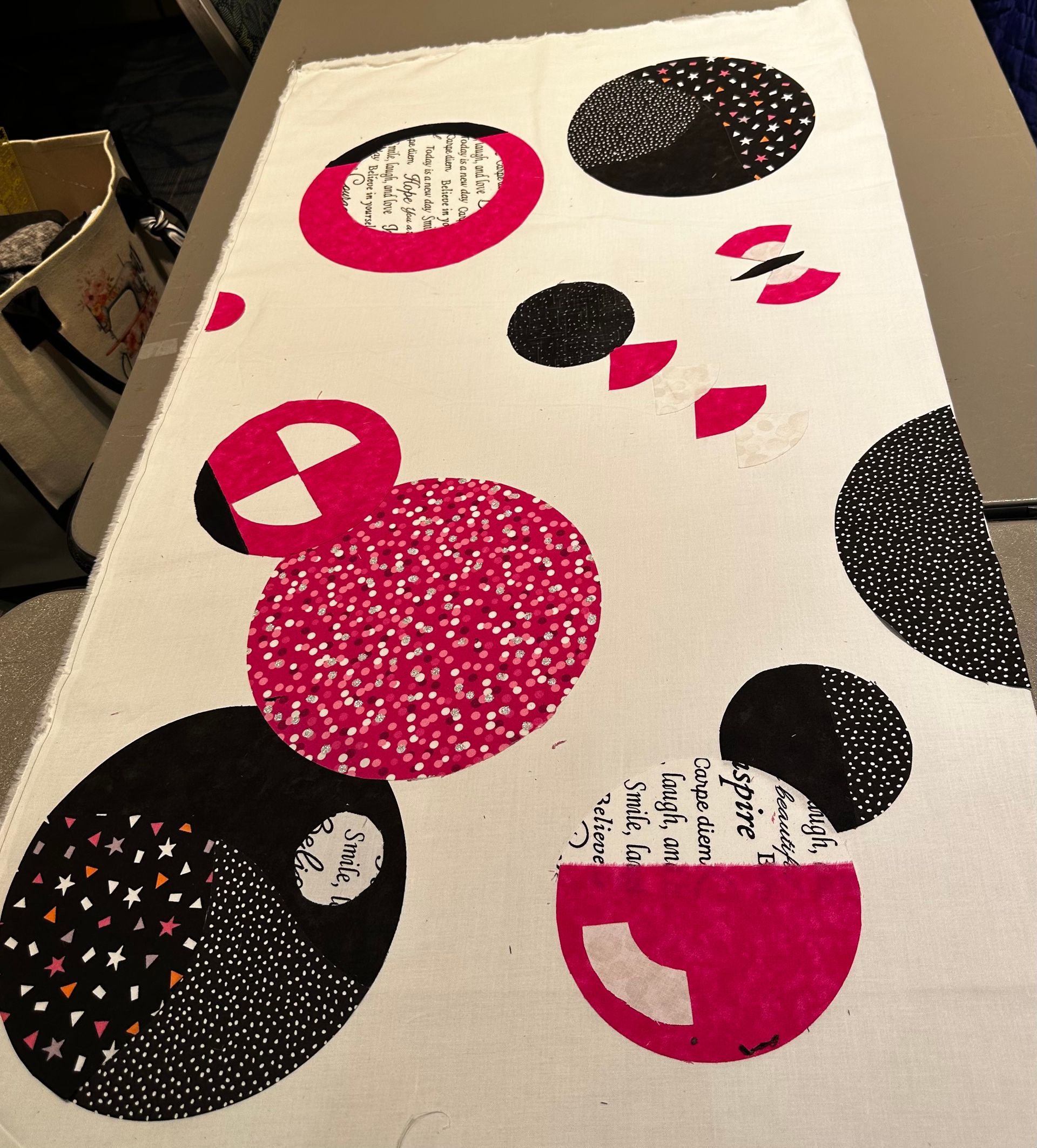 In this half day workshop (3-4 hours), students are making a contemporary wall hanging with random, collaged/appliqued circles. Different ways to make these circles are being shown. It is an improvisational class