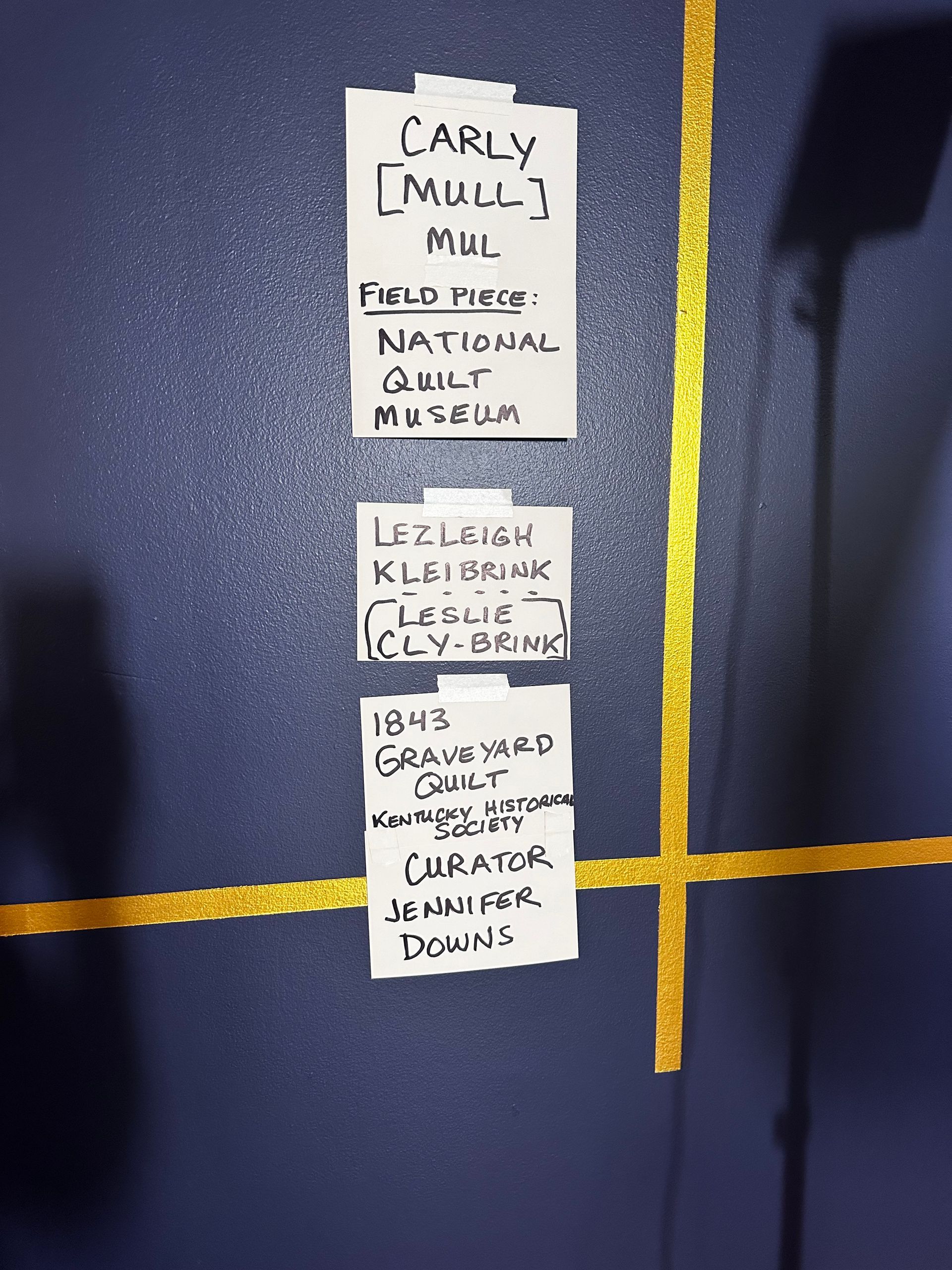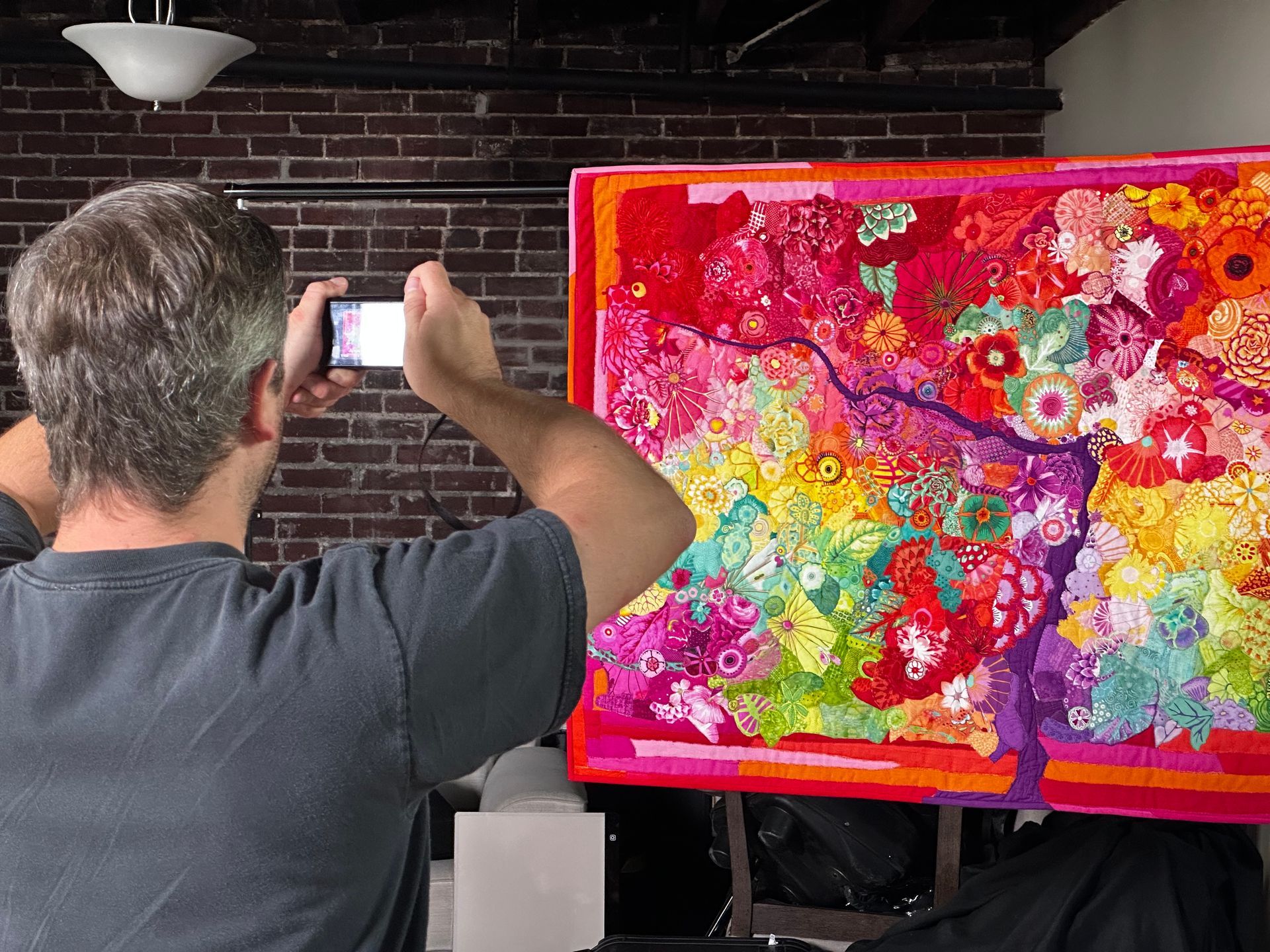 The way they set this up is really smart. The Quilt Show rents a big house in a place, this time Louisville, KY, where there is room not only for taping but also for hosting the entire crew. The house in Louisville was big! The taping happened on the third floor. Floor one and two were bedrooms for the crew, kitchens for food preparation and cool drinks. Places to hang out and relax as the work is intense. They are making it a home for a week. Rooms for the guest to change, to lay out quilts. I felt the honor of being a guest the most when I was able to take this photo of the closet of Ricky's shirts. He and Alex change outfits for every show, but not after asking the guest which color he/she is wearing. They adjust their clothing to the guest and that is such a nice gesture of hospitality. To me this photo is priceless and so telling about the experience.