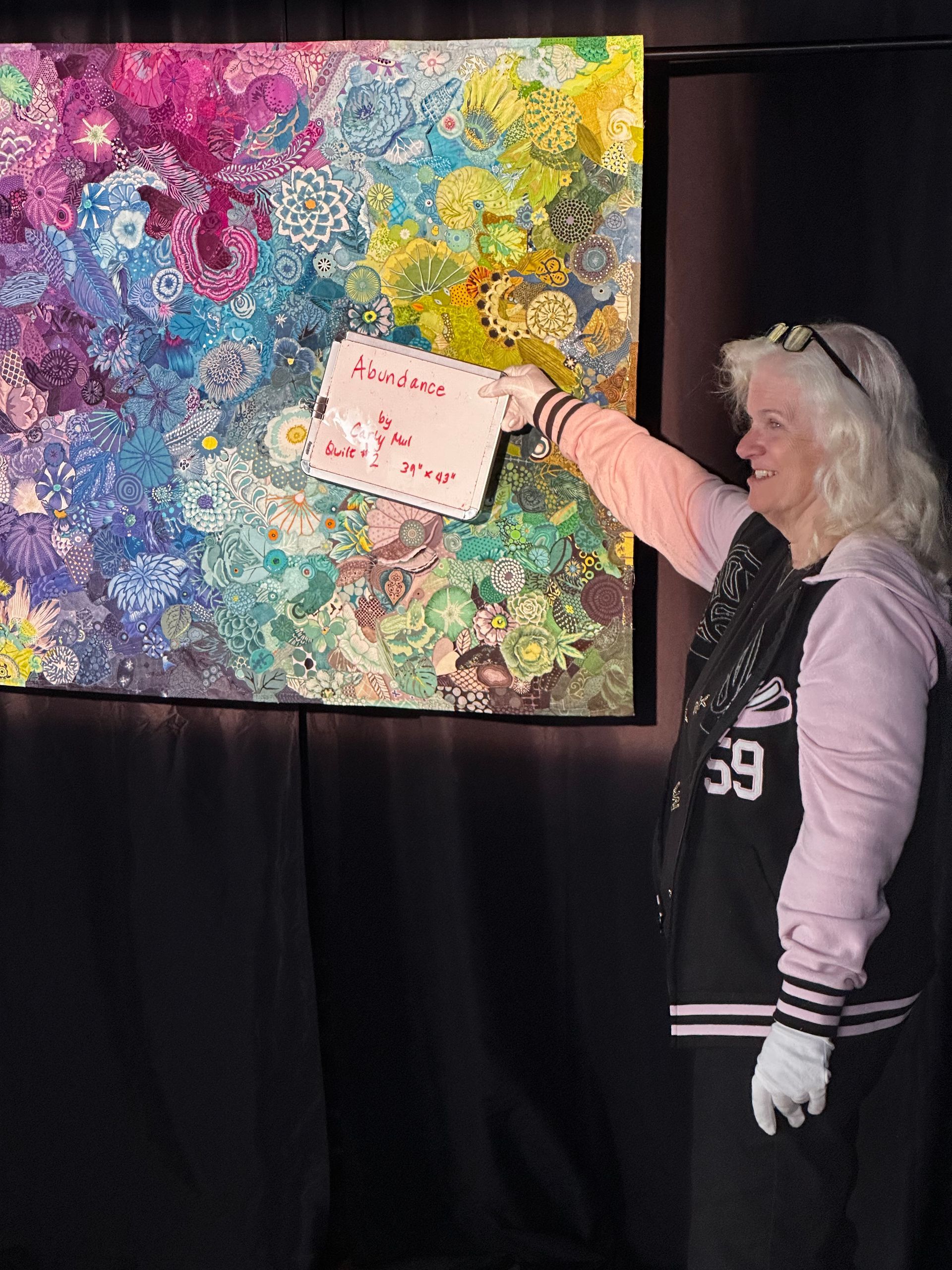 They ask you to arrive a little early so that your quilts can air out after having being folded in a suitcase, but it is not only the quilts that benefit from this. By arriving earlier, I could get used to the setting, see the taping of Nina Clotfelter, the guest before me. It takes the nerves away. Now I am not really nervous talking in public and don't have issues with formulating myself, but I was dreaming the night before the taping that the buttons of my dress would somehow jump off during taping! Apparently there was some unconscious anxiety in me after all. I had a backup dress, knew that it wasn't live-tv, so I went back to sleep....