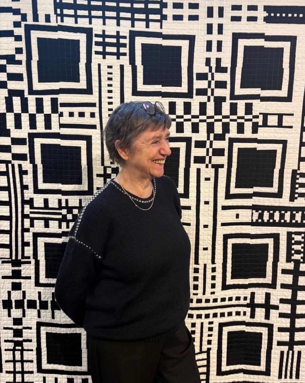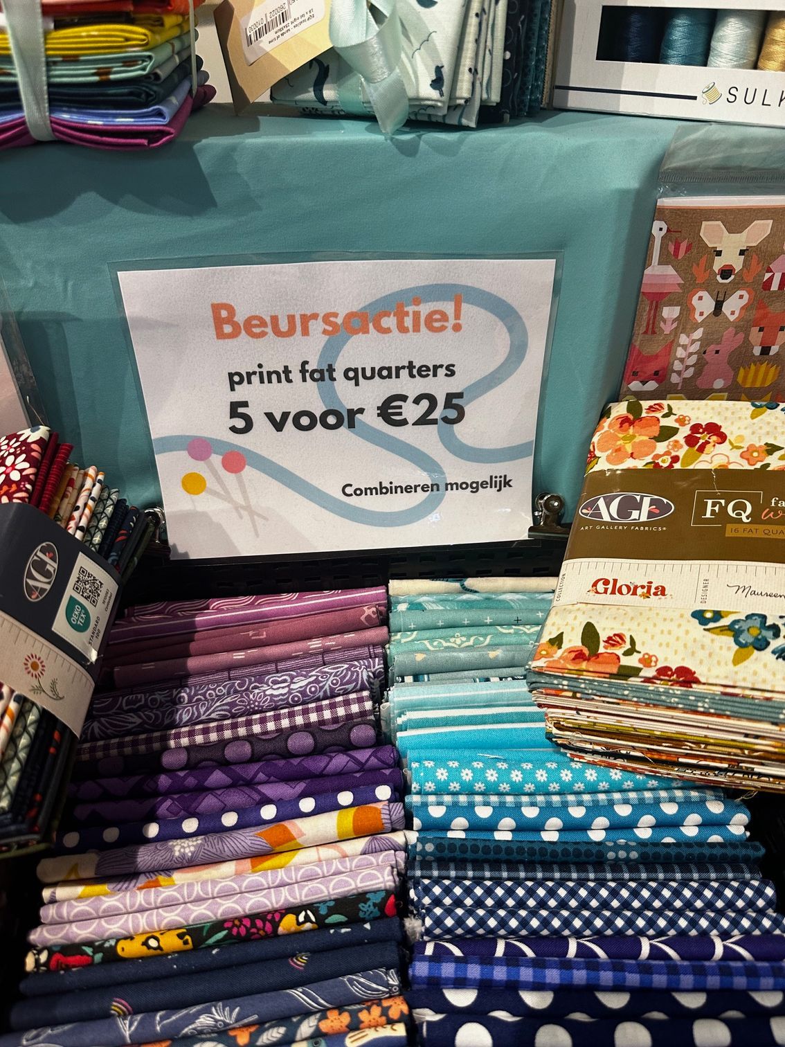 of her work on social media understand how incredible it was. Ineke makes mostly king size quilts and has a big soft spot for black and white. Ten of her black and white quilts were in exposition, but she has even more at home! There were also 6 colored quilts, all very recent ones, which is a little sad as it would have been so interesting to see where she came from. But it is really hard to choose! When I met Ineke years ago, she was a customer. She ordered fabric often as the price of fabric is so much lower in the US and we started chatting. I liked her. To help her save money on shipping I once dropped a suitcase full of fabric at her home ( I actually did this together with my mother!) and since that day we have been buddies. I have delivered many suitcases over the years. By the way, at the moment shipping to Europe is possible but extremely expensive. I don't think it makes sense for Europeans to order, because what they save on fabric is spent on shipping and import duties. Fabric is and has always been expensive in Europe. It is now about 22 euro per meter and with today's the low Dollar value this equals to about $27.00 per yard! A fat quarter special "deal" I saw was 5 for 25 euro, almost $30.00! Count your blessings!
